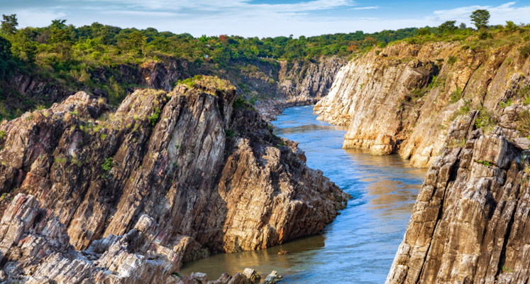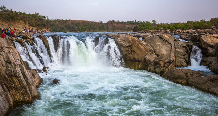 The Dhuandhar Falls, fall in Jabalpur district in the Indian state of Madhya Pradesh. The Falls are located on Narmada River in Bhedaghat and are 10 meter high. The Narmada River, makes its way through the world-famous Marble Rocks, narrows down and then plunges in a waterfall known as Dhuandhaar. The plunge, which creates a bouncing mass of mist, is so powerful that its roar is heard from a far distance. And the energy produced may be used in Hydro-electric power plant.