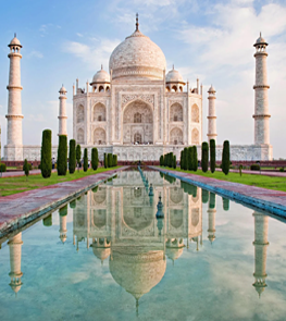 The Taj Mahal in Agra is an immense mausoleum of white marble, built between 1632 and 1653 by order of the Mughal emperor Shah Jahan in memory of his favorite wife. Called “a teardrop on the cheek of eternity” it is one of the masterpieces of Mughal architecture, and one of the great tourist attractions in India. Besides the white domed marble mausoleum the Taj Mahal includes several other beautiful buildings, reflecting pools, and extensive ornamental gardens with flowering trees and bushes.